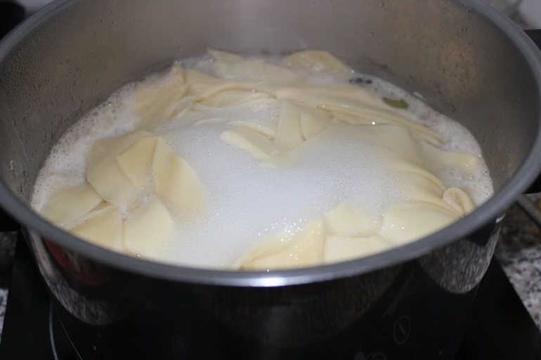 А в бульон сбрасываем лепёшки, бульон должен быть хорошо посолен, тк лепёшки без соли