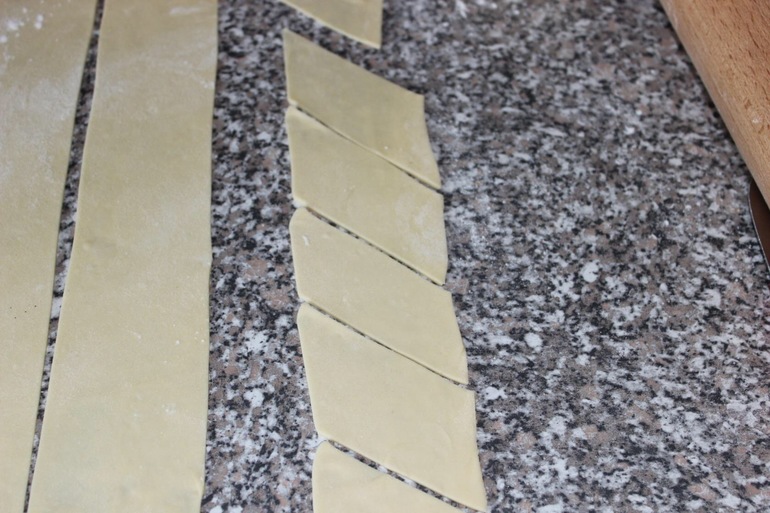 Тесто раскатываем в тонкую лепёшку и нарезаем лепёшки