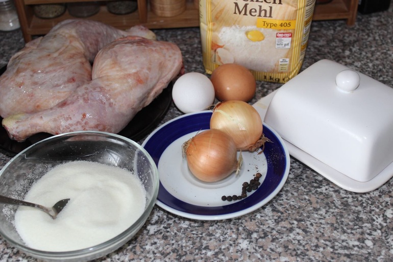 Ставим варить мясо, бросаем перец горошком и варим около часа пока мясо неначнёт отходить от кости. В это время делаем тесто смешиваем яйца, воду, муку и замешиваем тесто.
