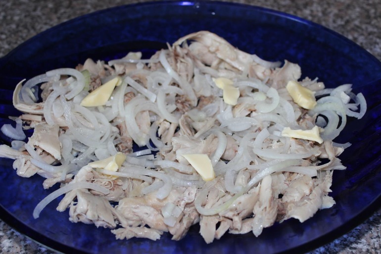 Мясо выкладываем на блюдо, сверху лук и кусочки сливочного масла