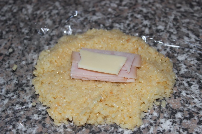 Добавляем яйцо, немного кунжута(можно без него) и делаем котлетки с начинкой с помощью пищевой плёнки.