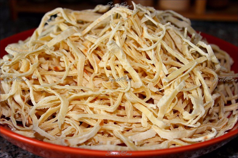 И теперь маленький секретик, мы обжариваем лепёшки на сухой сковороде, буквально несколько секунд, так их потом легко нарезать и лапша не разбухает и не разваривается.