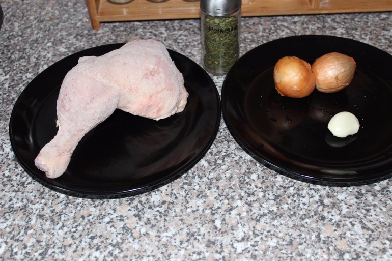 Начинаем с варки бульона, холодную воду с окорочком ставим на сильный огонь, как только закипело, убавляем огонь, снимаем пену, закладываем хорошо помытый лук в кожуре (именно он придаст нашему бульону, красивый жёлтый оттенок) и бросаем зубчик чеснока