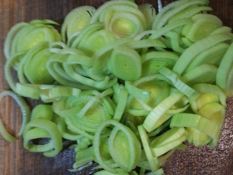 Нарезать лук порей кольцами: