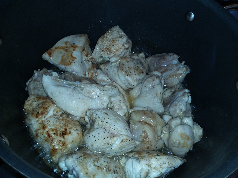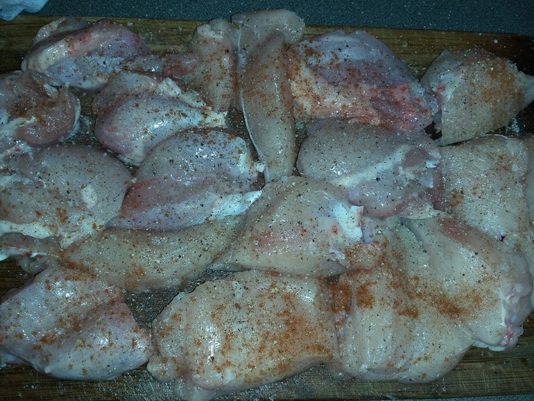 Срезать курицу с костей, нарезать порционно. Посолить и поперчить: