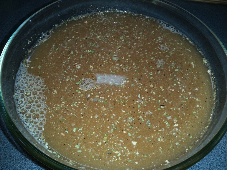 Размешать в теплой воде сахар, паприку, куркуму,майоран и тимьян: