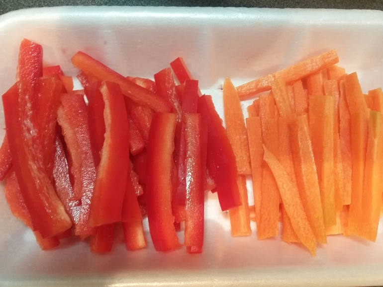 Нарезать брусочками болгарский перец, морковь: