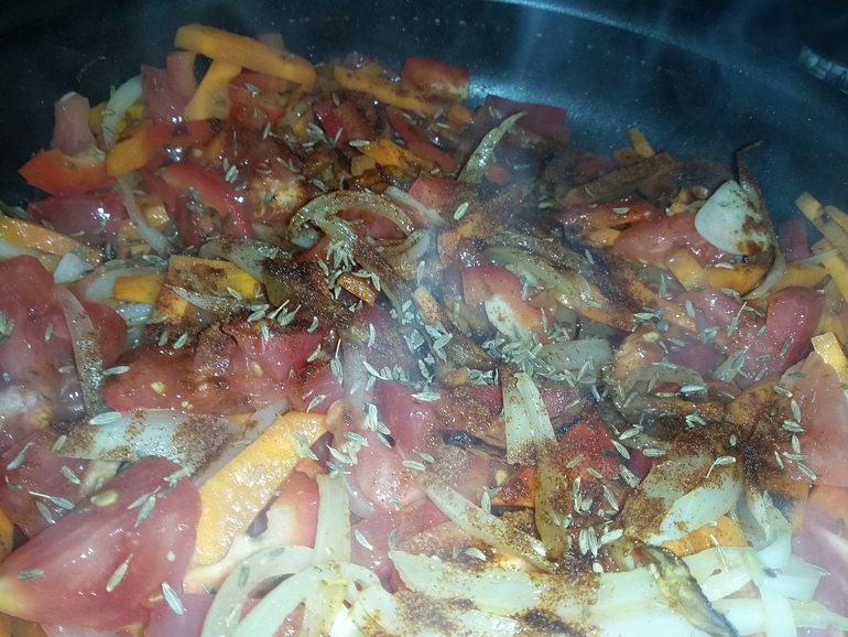 Добавить черный и красный перец, зиру: