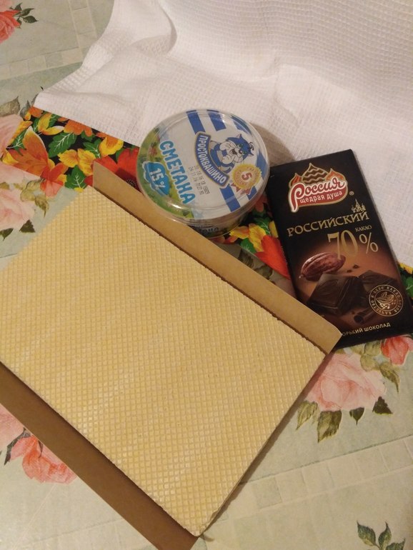 Растопили шоколад на водяной бане. Вафельные листы 3 шт резали попалам и с одной стороны тонким слоем промазывали шоколадом. Сметану и варенье смешали и немного взбили миксером. Все листы промазали сметанным кремом, а остатки шоколада вылили сверху и дети размазали как хотелось им. Поставили в холодильник на час. Я не ожидала что будет так вкусно, попробуйте и вы приготовить😉