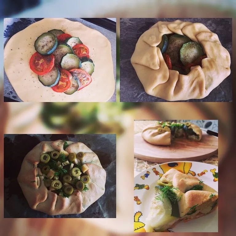 Равномерно распределяем овощную начинку по галете, чередуя, укладываем овощи по кругу, оставляя большие края. Солим, перчим и затем защипываем края, накладывая слои теста друг на друга.