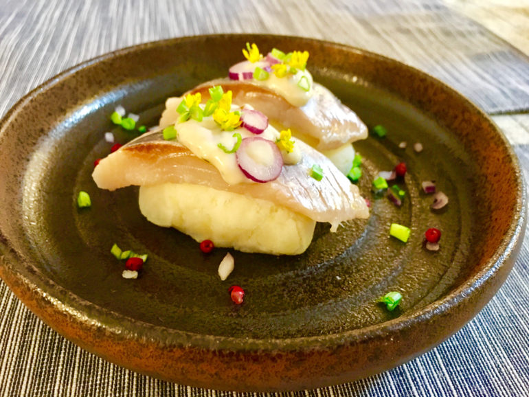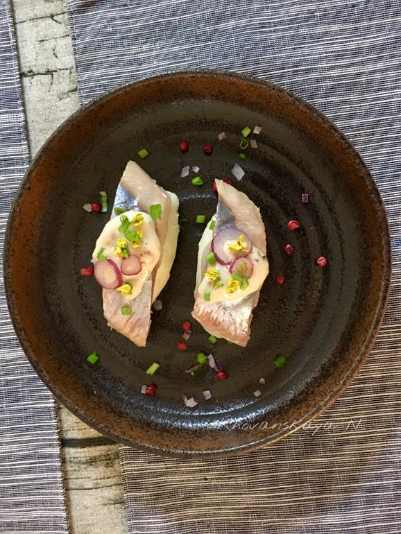 Сформировать из толченой картошки небольшие "колбаски" около 4 см длиной, и пары сантиметров толщиной. Сверху селедку, на неё пол чайной ложки соуса (что-то мне подсказывает, что смешав майонез с хреном в пропорции 2:1 будет тот же результат) . Посыпать мелкопорезанным луком.