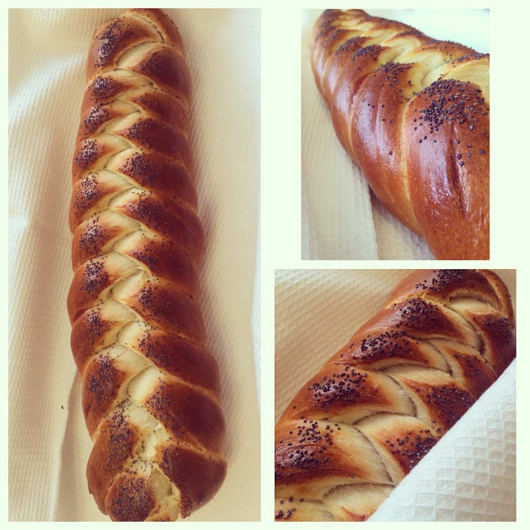 Покрываем противень пергаментом, выкладываем хлеб и оставляем на 20 минут для расстойки. Смазываем смесью яйца и молока, посыпаем маком. Выпекаем 20 минут при 190 градусах. Хала готова!