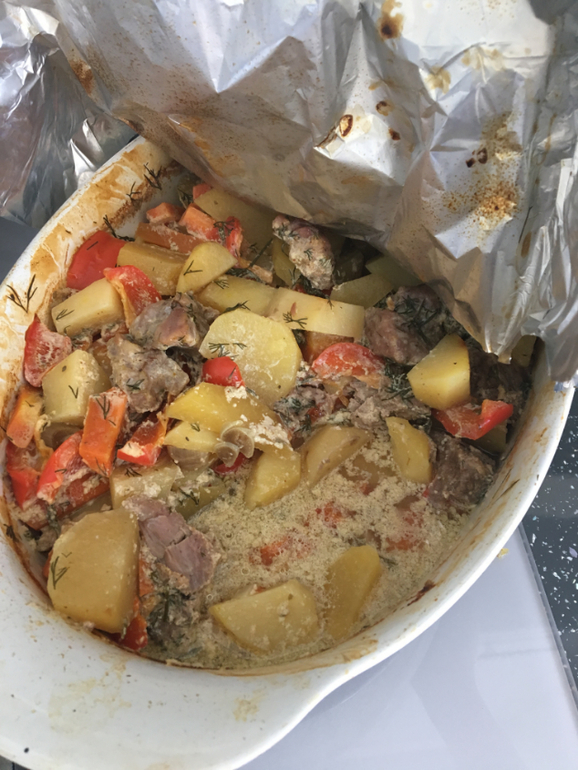 Ингредиенты: Картофель+перец+морковь+индейка+зелень+йогурт перемешать, запекать 1,5 часа