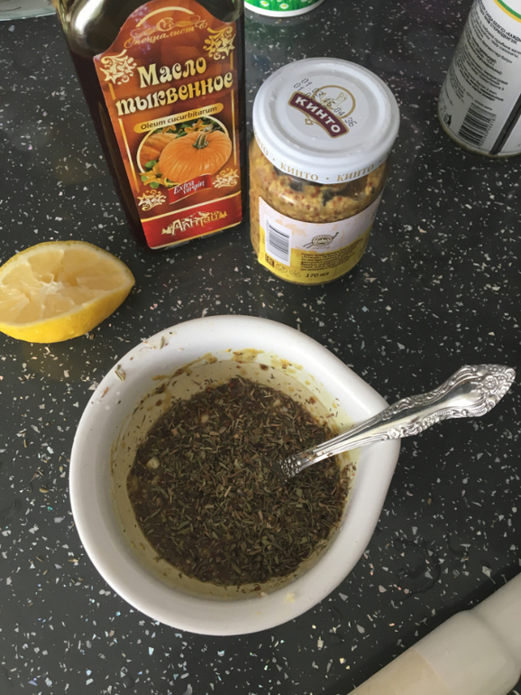 Заправка: масло (у меня тыквенное)+ горчица+сок лимона+специи