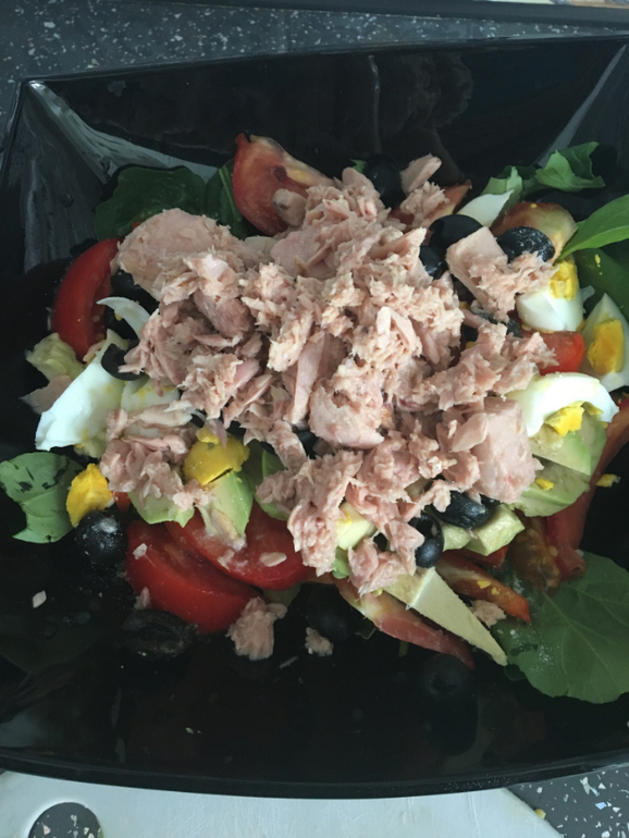 Маслины+яйца+тунец+помидоры+авокадо+базилик