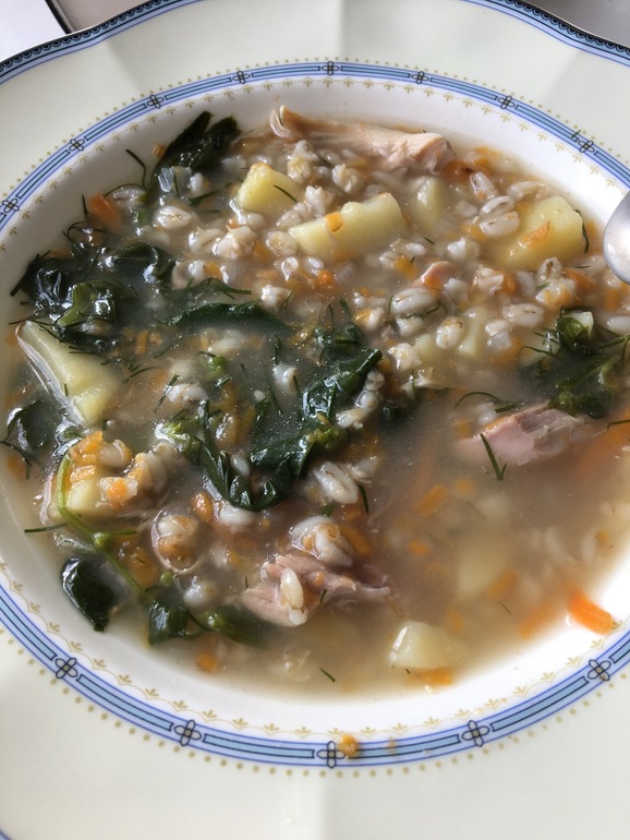 Ингредиенты: курица, перловка,морковь,лук,сол.огурцы, картофель, зелень