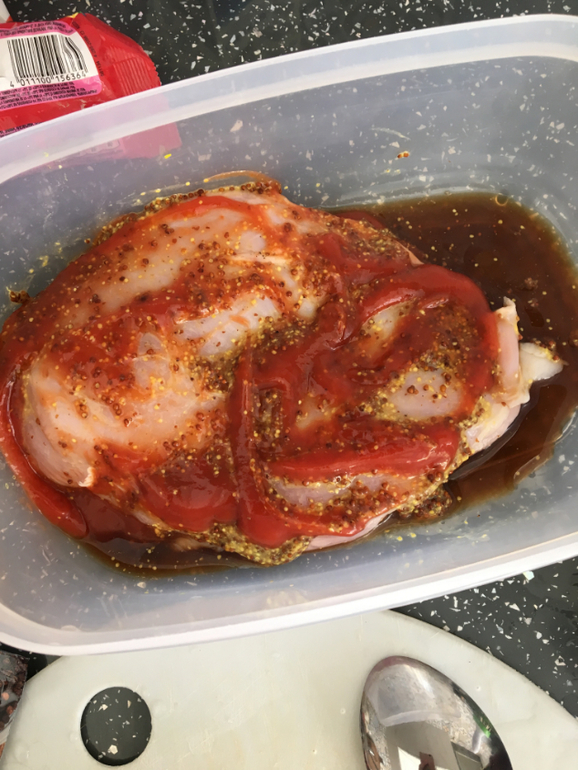 На ночь замариновать грудку: соевый соус+зерновая горчица+томатная паста+ прованские травы+соль