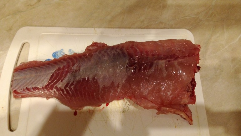 Делаем надрез под шкуркой карпа около плавника острым ножом сантиметров на 3-4, а дальше отделяем филе рыбы рукой по направлению от плавника к хребту. Около головы делаем надрез внутрь и ножом перерубаем хрящ у хребта и хвоста. Таким образом мы отделяем филе от шкурки.