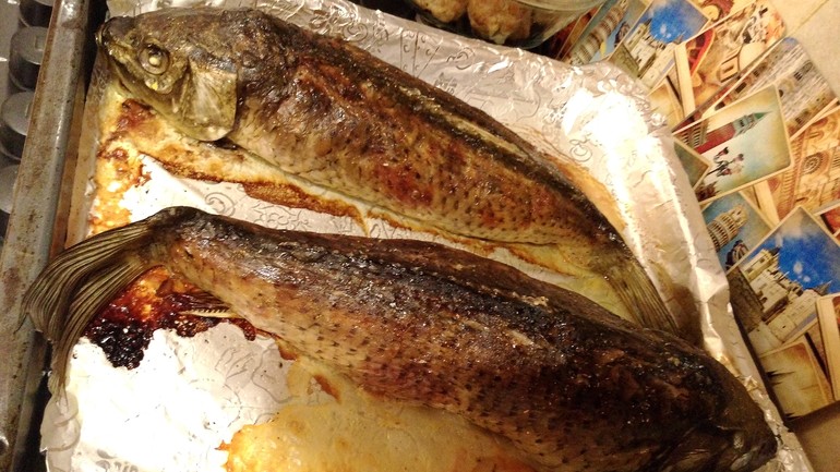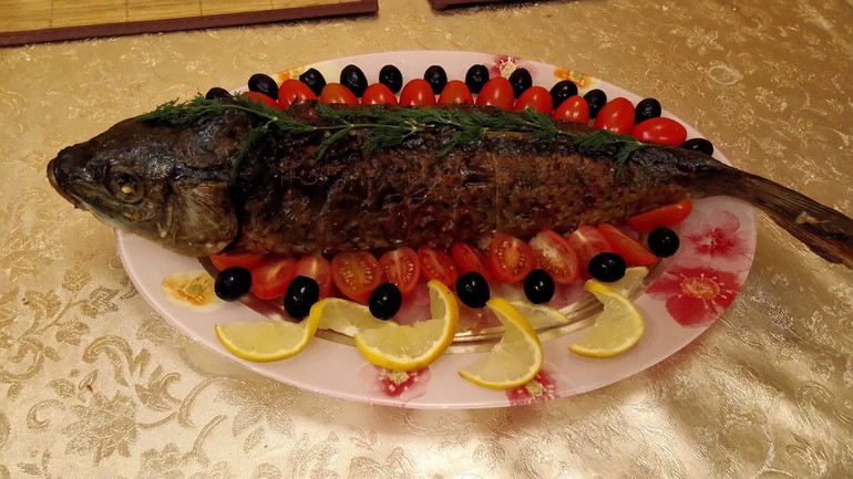 Далее этой начинкой заполняем шкурку карпа, я начала от хвоста, затем по хребту, и брюшко. Низ не зашивала, просто прижала рукой края и положила на фольгу, смоченную растительным маслом. Затем немного полила рыбку маслом и присыпала немного приправой для рыбы (но это не обязательно). Ставим в духовку на 1 час-1,5 часа (в зависимости от духовки). Единственное что нужно было сделать это проколоть иголкой кожу рыбы в нескольких местах, я забыла и у меня рыбка немного треснула. Дать остыть и украсить по желанию, многие смазывают майонезом в виде узоров, я не стала.