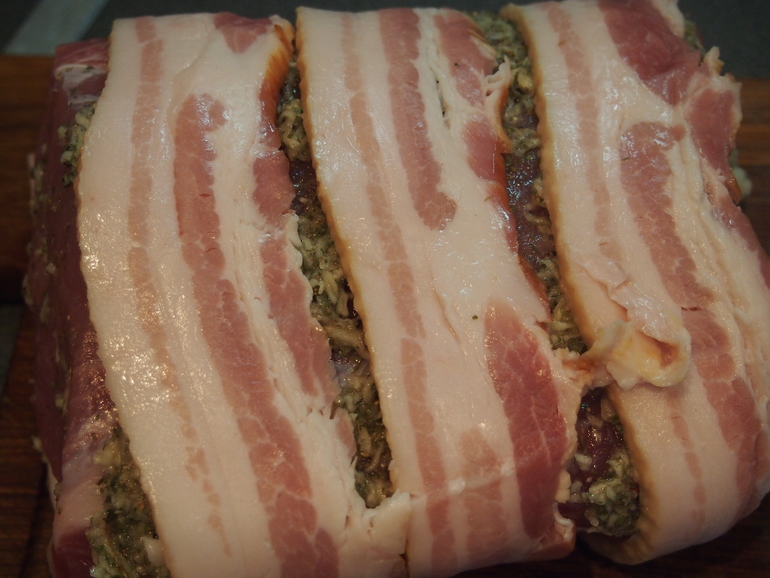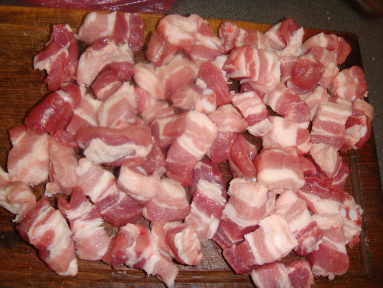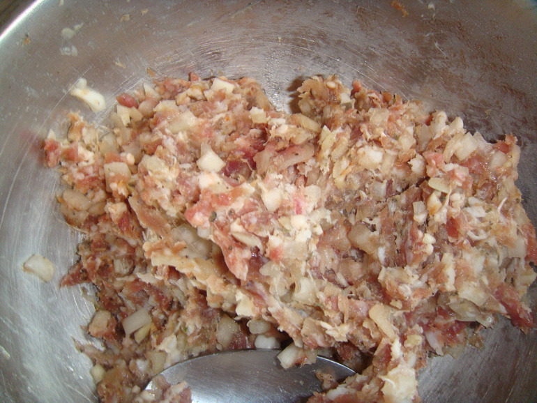Снять пленки и шкурку с куска свинины, смолоть вместе с луком: