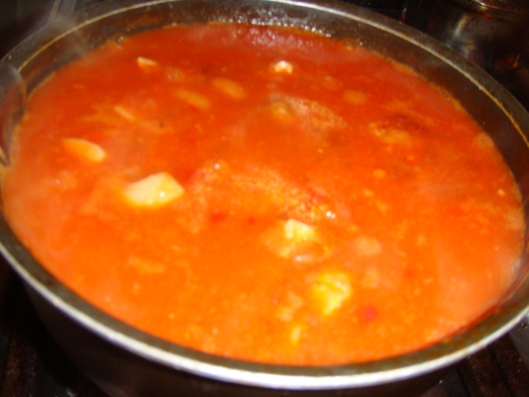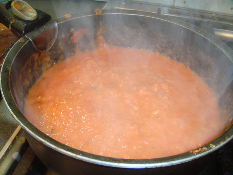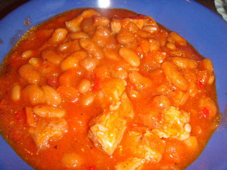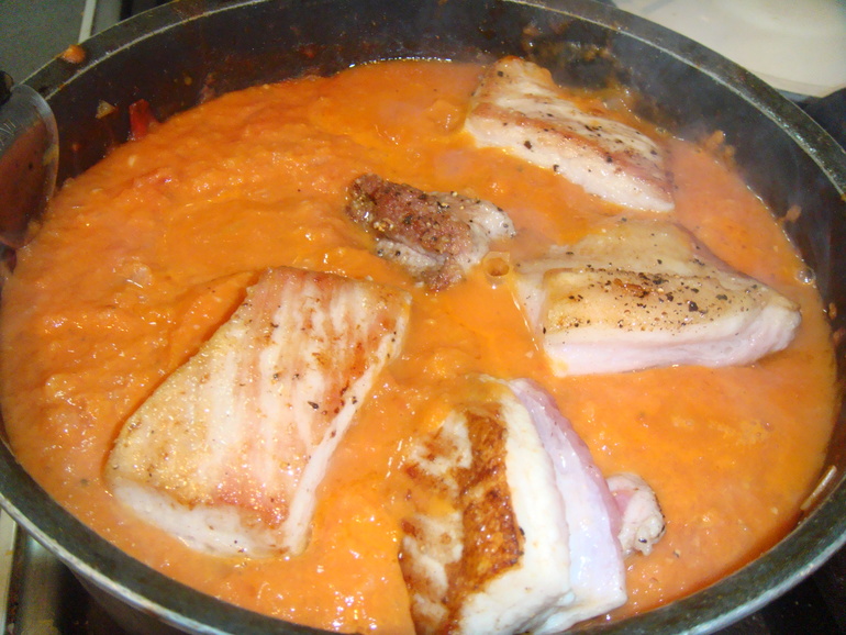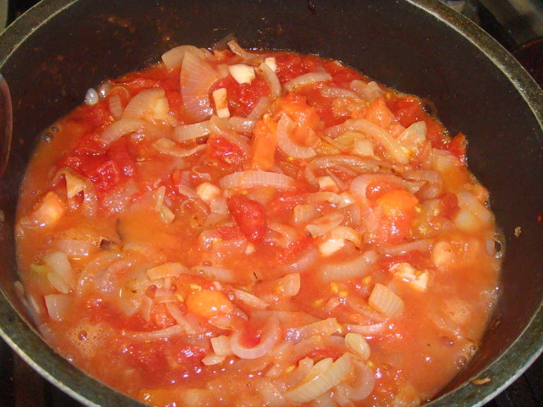 Добавить замоченную фасоль и влить разведенную кипятком томатную пасту с сахаром и паприкой: