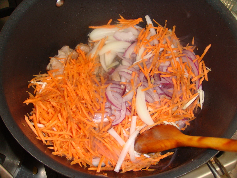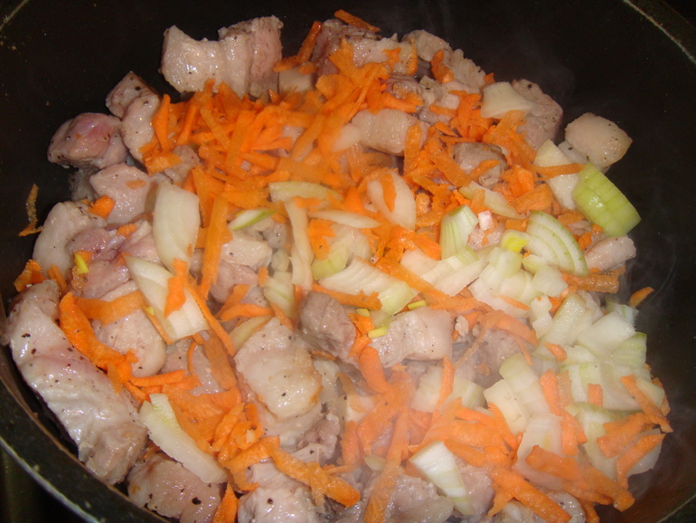 Через 10 минут добавить лук и морковь и продолжать тушить в выделившемся соке: