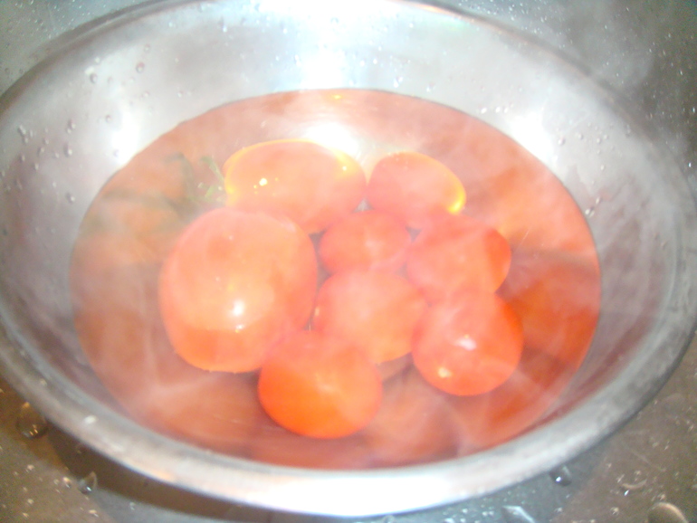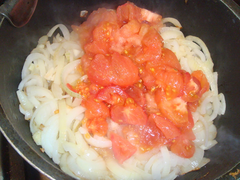 Переложить помидоры в холодную воду. Снять кожицу. Порубить, добавить к луку в сотейник: