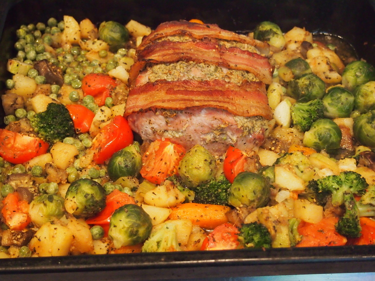 Переложить на противень со стаканом воды, закрыть фольгой и запекать примерно час. Затем добавить помидоры, лук, чеснок, цуккини, брокколи, брюссельскую капусту, горошек, морковь и запекать еще минут 15: