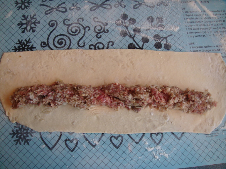 Замесить крутое тесто из 1 стакана воды, 0,5 ч.л. соли и 1 яйца. Раскатать тесто тонким слоем, разложить начинку: