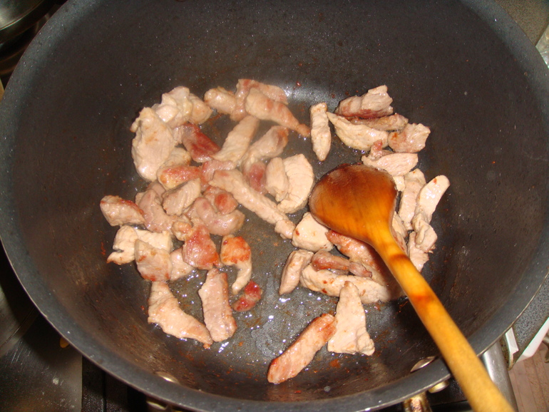 Нарезать свинину тонкими брусочками и обжарить в масле на сильном огне: