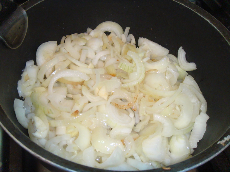 Но начать надо с овощей. 5 луковиц нарезать и спассеровать в растительном масле: