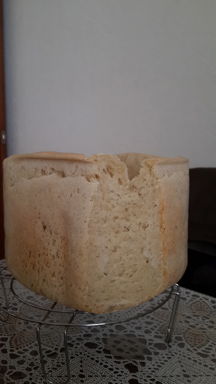 у вас хлеб проседает, а должен быть холмиком. добавьте чуть больше сахара и булка будет больше. например у меня 2 ч.л сахара, а я кладу с горкой и хлеб получается пышный.