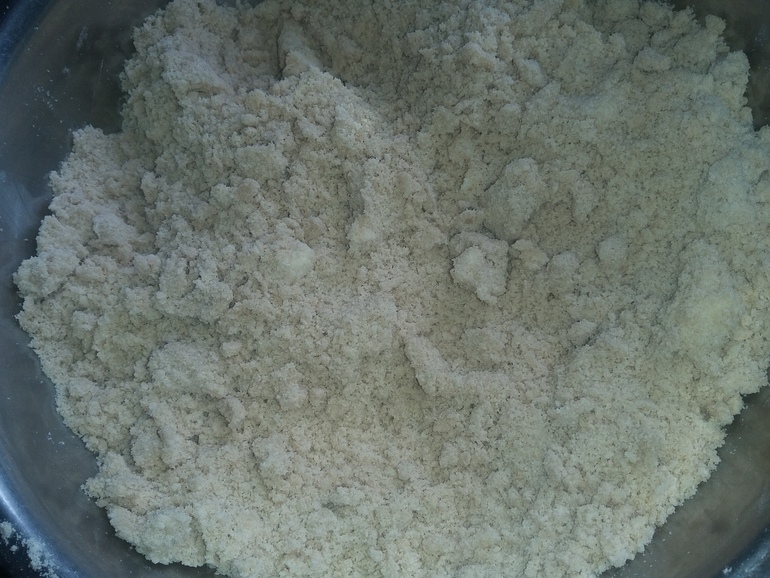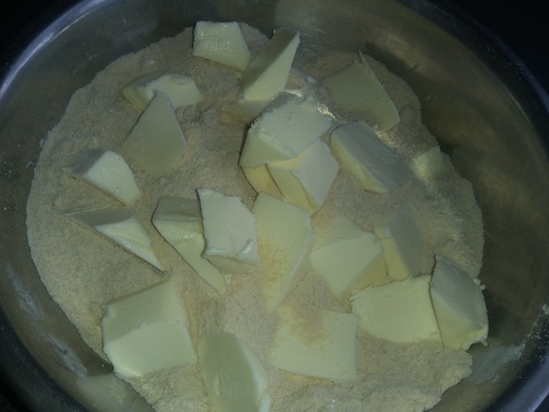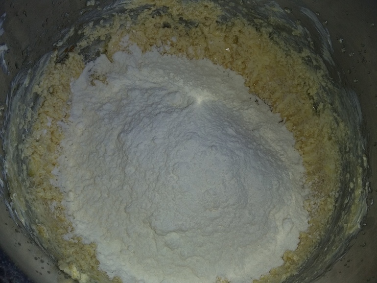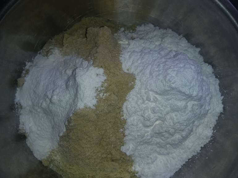 Смешать 2 стакана муки, 1 стакан сахарной пудры, 2 ч.л. разрыхлителя, 1 ч.л. сухого имбиря: