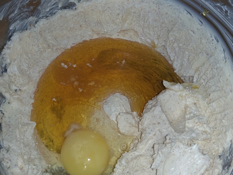 Растереть, добавить 1 яйцо и 0,5 стакана меда: