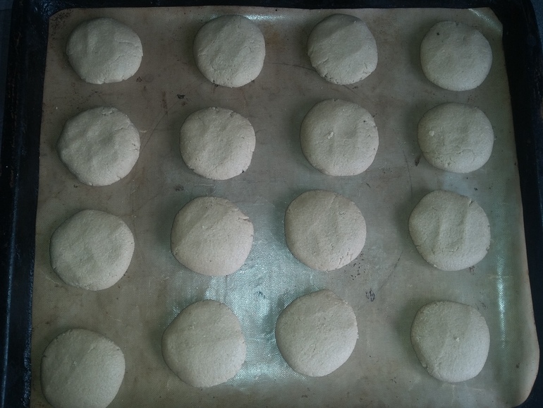 Скатать небольшие шарики, расплющить в ладонях, положить на противень: