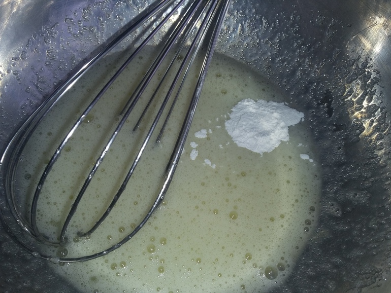 Смешать венчиком (не взбивать!), добавить 1 ч.л. разрыхлителя: