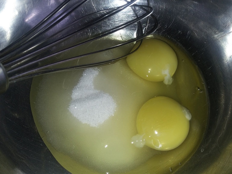 2 яйца, 0,5 стакана сахара, стакан муки и каплю лимонного ароматизатора поместить в миску:
