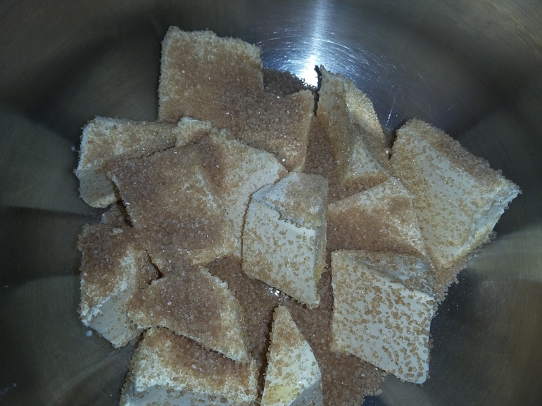 200 г сливочного масла и 0,5 ст. коричневого сахара положить в чашу миксера: