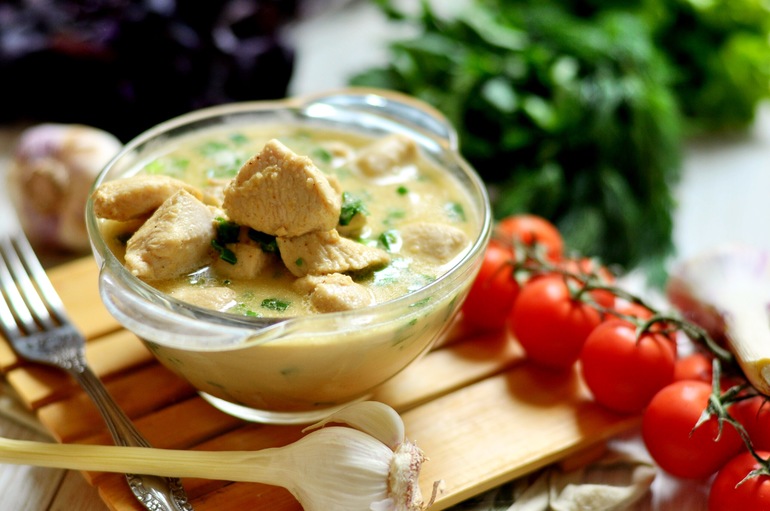 Грудку промываем, срезаем лишние плёнки и жир. Нарезаем на кубики одинакового размера, чтобы мясо готовилось одновременно. Сковороду накаляем, обжариваем мелко нашинкованный чеснок. Добавляем к чесноку кусочки птицы, обжариваем до изменения цвета курицы. Грудка должна быть белой снаружи и розовой внутри. Пока жарится грудка делаем соус : Кокосовое молоко смешиваем с соевым соусом и специями. Вливаем молоко к мясу и хорошо перемешиваем. Тушим под крышкой, иногда помешивая на среднем огне, 3 минуты. Сковороду снимаем с огня сразу и даём блюду настояться ещё минут 5. Будьте аккуратны и старайтесь не перетушить грудку, поскольку она готовится очень быстро, её легко пересушить. Посыпаем готовое блюдо зеленью и подаём к столу. Приятного аппетита.