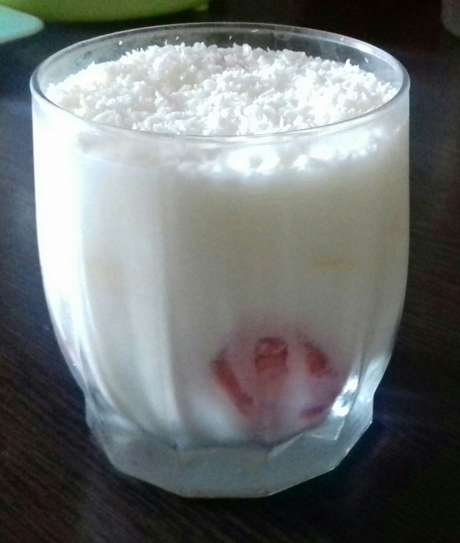 Смешать йогурт с сахаром. Йогурт я использую питьевой, жирностью 2-3,5%. Порезать ломтиками клубнику и бананы. Чуть остывший,теплый желатин влить в йогурт и тщательно перемешать. Разлить по стаканам по чуть-чуть йогуртно-желатиновой смеси,положить клубнику и бананы,залить чуть йогуртом, положить еще слой клубники с бананом и залить полностью стаканы. Отправить на несколько часов в холодильник для застывания. Перед подачей посыпать кокосовой стружкой.