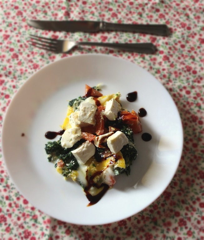 Сковороду я смазала немного оливковым маслом. Обжарила шпинат, добавила томаты, влила слегка взбитые яйца. Посолила и поперчила. Далее добавила 5-6 кубиков феты. При подаче сбрызнула бальзамическим кремом и посыпала кунжутом.