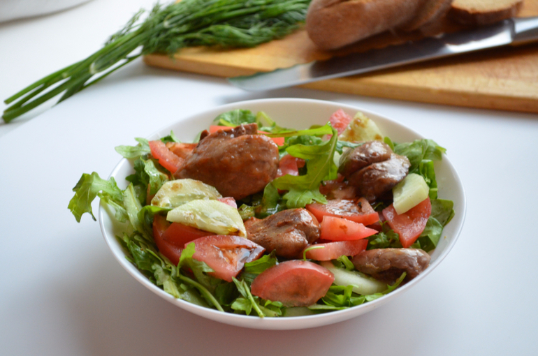 На этой неделе делала капустный салат с огурцом, зирой и семечками и салат из помидоров и огурцов с теплой печенью в винно-медовом соусе.