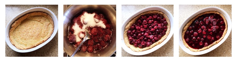 Тесто замесить, смешав все ингредиенты и убрать на час в холодильник. Тем временем ягоду разморозить и отделить от получившегося сока. Ягоду просушить полотенцем бумажным, а образовавшийся сок прокипятить с сахаром.