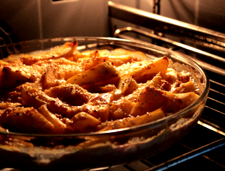 Картофель чистим, моем, режем дольками. Добавляем прованские травы, кетчуп и соль, тщательно мешаем.Затем вводим молоко, размягченное сливочное масло, сыр натертый на мелкой терке, рубленную зелень лука. Опять очень тщательно мешаем. Обильно посыпаем кунжутом. Запекаем в духовке при 200° .