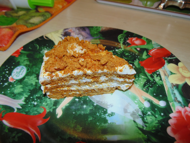 Готовым коржам дать остыть. Сложить из них торт промазывая каждый слой кремом. Верх и бока тоже обмазать и присыпать крошкой из измельченных обрезков.