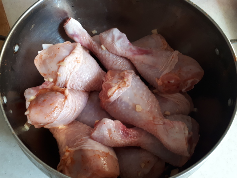 Перво-наперво моем и маринуем куриные голени. А именно: солим, перчим, добавляем ч.л. уксуса, разведенную в 3 ст.л. воды. Туда же добавляем рубленный чеснок.