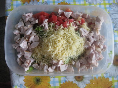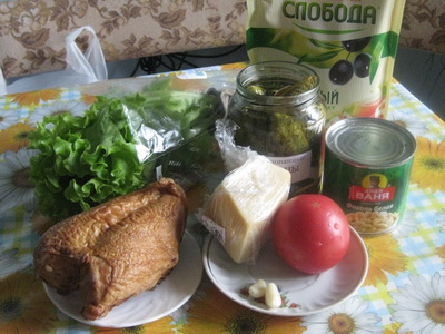 Пропорции примерные, ведь и грудка разного веса бывает и помидоры с огурцами разного размера. Пишу пропорции на продукты среднего размера (огурцы у нас домашнего соления, не маленькие магазинные). Копчёная грудка -1 шт., фасоль белая - 1 банка (400 гр.), огурец маринованный - 2-3 шт., сыр твёрдых сортов (мы российский берём) 70 гр., салат листовой 1 пакетик, помидор 3 шт., чеснок 2 зубчика, майонез (не провансаль).