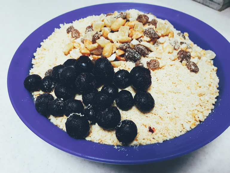 Я измельчаю блендером. Уходит менее 5 мин. В печенье добавить чернику и ореховую смесь (у меня комбо арахис+ананасы и вишня)