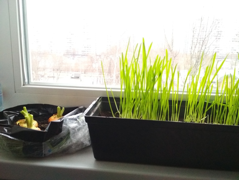 неее, пакет, в котором был остаток земли, не отрезала, закатала чулком и в него посадила лук. Рядом растет овес для котов