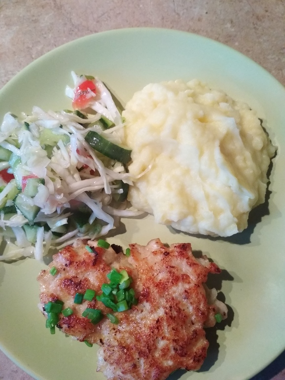 Идеально подходит пюрешечку, Софа, пока мама жарила, накрошила салат.